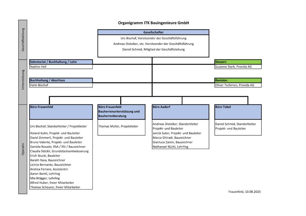 Die Firma ist stetig gewachsen und hat heute nebst den drei Gesellschaftern vier Mitarbeiterinnen, zehn Mitarbeiter und drei Auszubildende. Von 1999 bis heute haben bei uns vierzehn Auszubildende die Lehre als Zeichner Fachrichtung Ingenieurbau erfolgreich abgeschlossen.